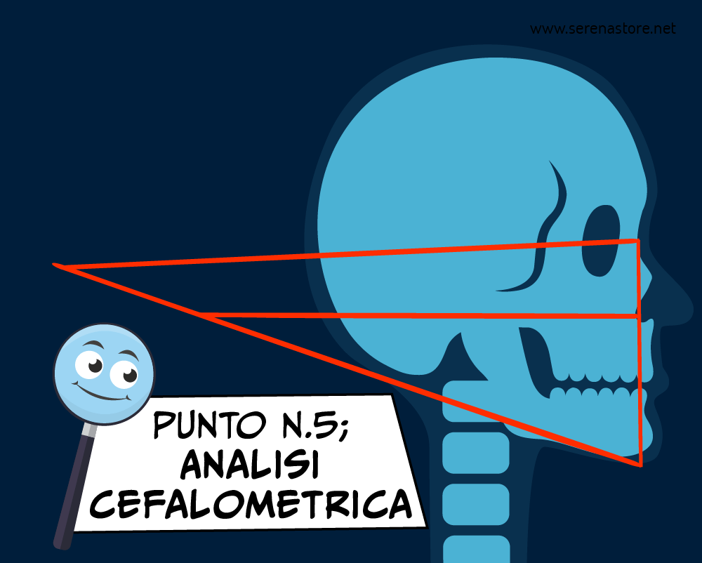 5. analisi cefalometrica (vengono effettuate delle misurazioni sulla teleradiografia che permettono di individuare il tipo scheletrico di malocclusione e la previsione di crescita)